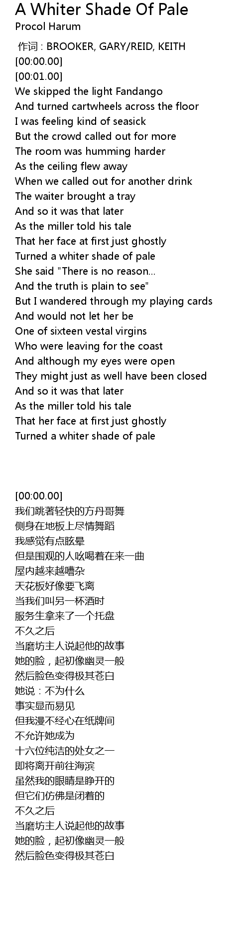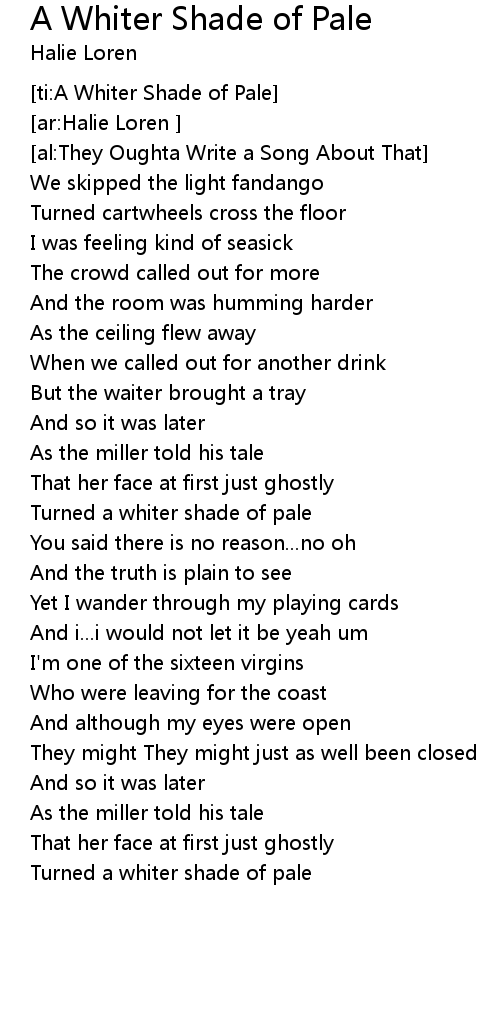 A Whiter Shade Of Pale (Lyrics Video) - Procol Harum, ONE OF OUR FAMILY FAVORITE SONGS: (Relaxing, Enjoyable, Lullaby and Memorable) A WHITER SHADE OF PALE (Procol . We Have got 9 pix about A Whiter Shade Of Pale Lyrics images, photos, pictures, backgrounds, and more. In such page, we additionally have number of images out there. Such as png, jpg, animated gifs, pic art, symbol, blackandwhite, pics, etc. "Procol Harum - A Whiter Shade of Pale Lyrics", Music composed in 1967 by Gary Brooker, Keith Reid and Matthew Fisher member of the British band Procol Harum. The lyrics . "Weiss wie Kalk (Cover von "A Whiter Shade Of Pale" von Procol Harum)", Deutsche Version von "A Whiter Shade Of Pale"" von Gary Brooker und Matthew Fisher, Text von Keith Reid (Procol Harum) ..